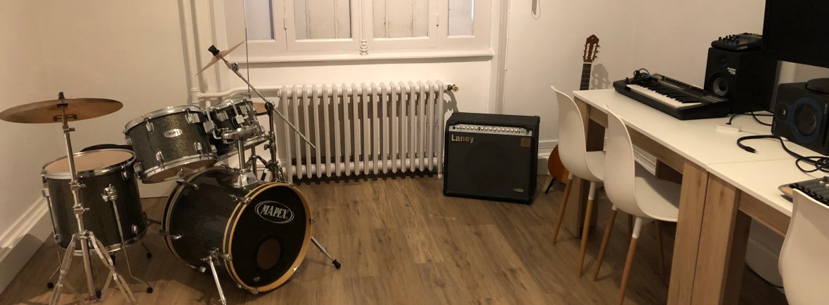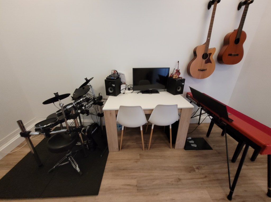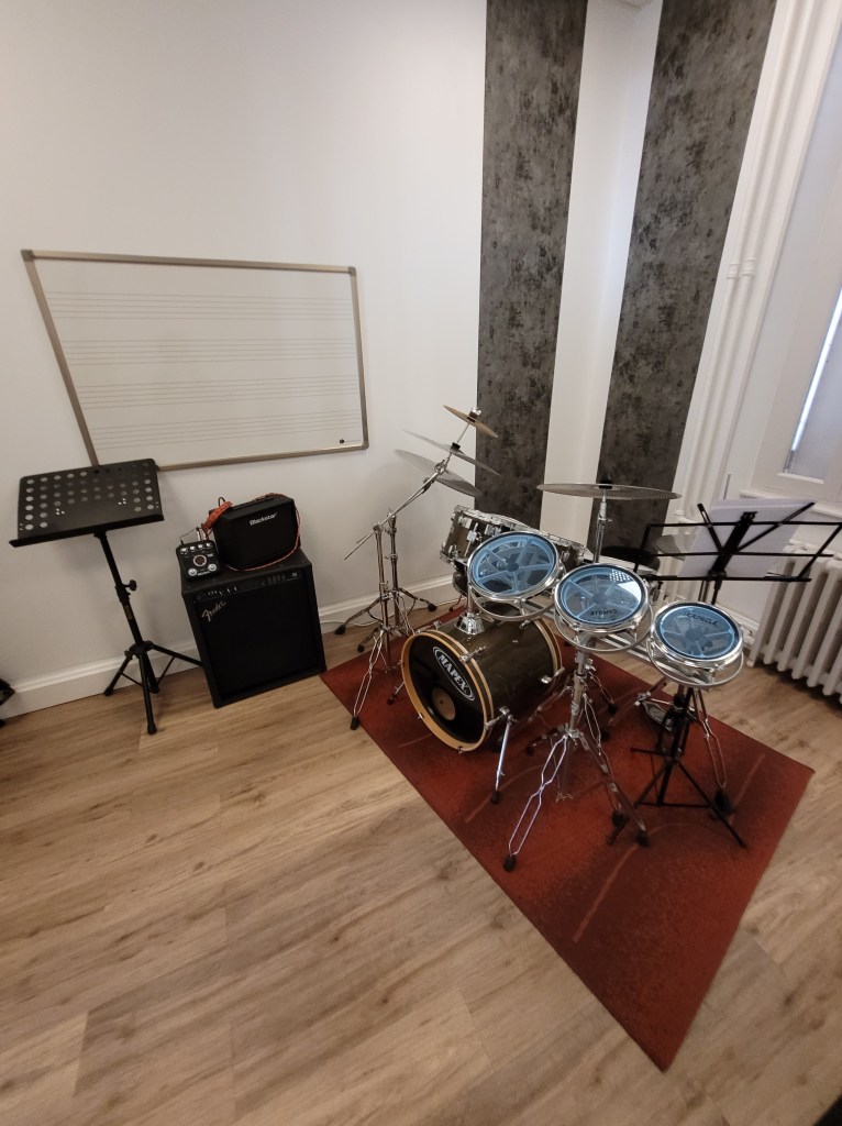 Nos élèves jouent sur une vraie batterie , aux peaux maillées pour le confort auditif. La salle dispose également d’une batterie électronique pour le travail en binôme (élève ou professeur).