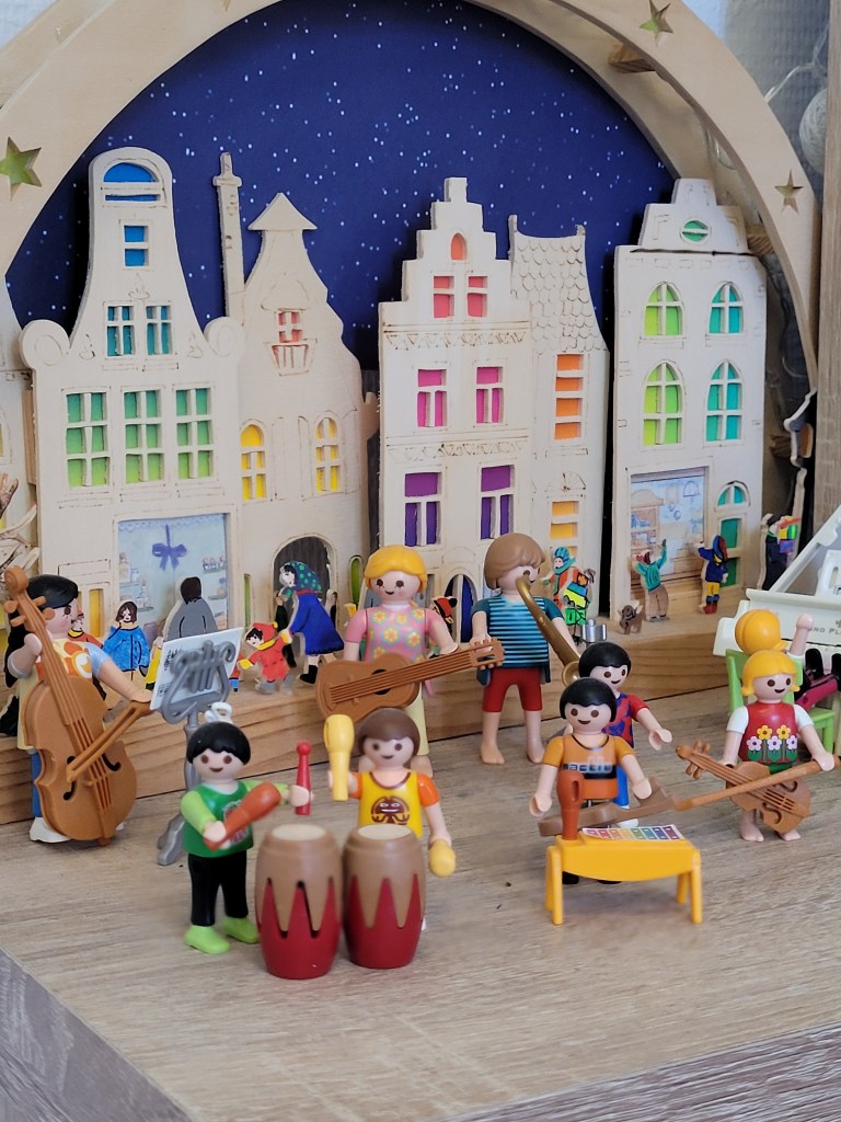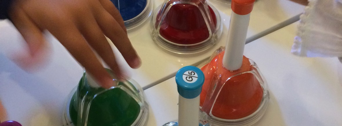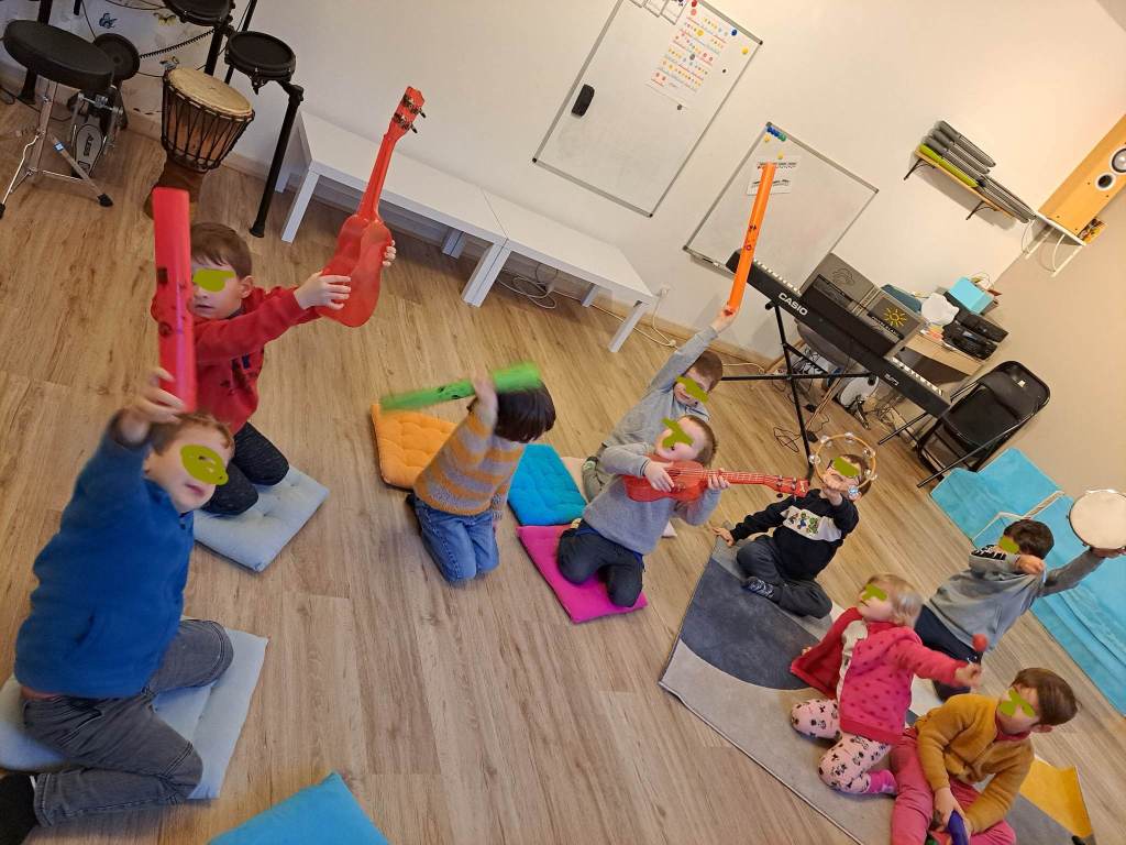 Petites percussions, cloches musicales basées sur un système de couleurs, approche du clavier et de la guitare, les enfants varient les activités et créent sans cesse.